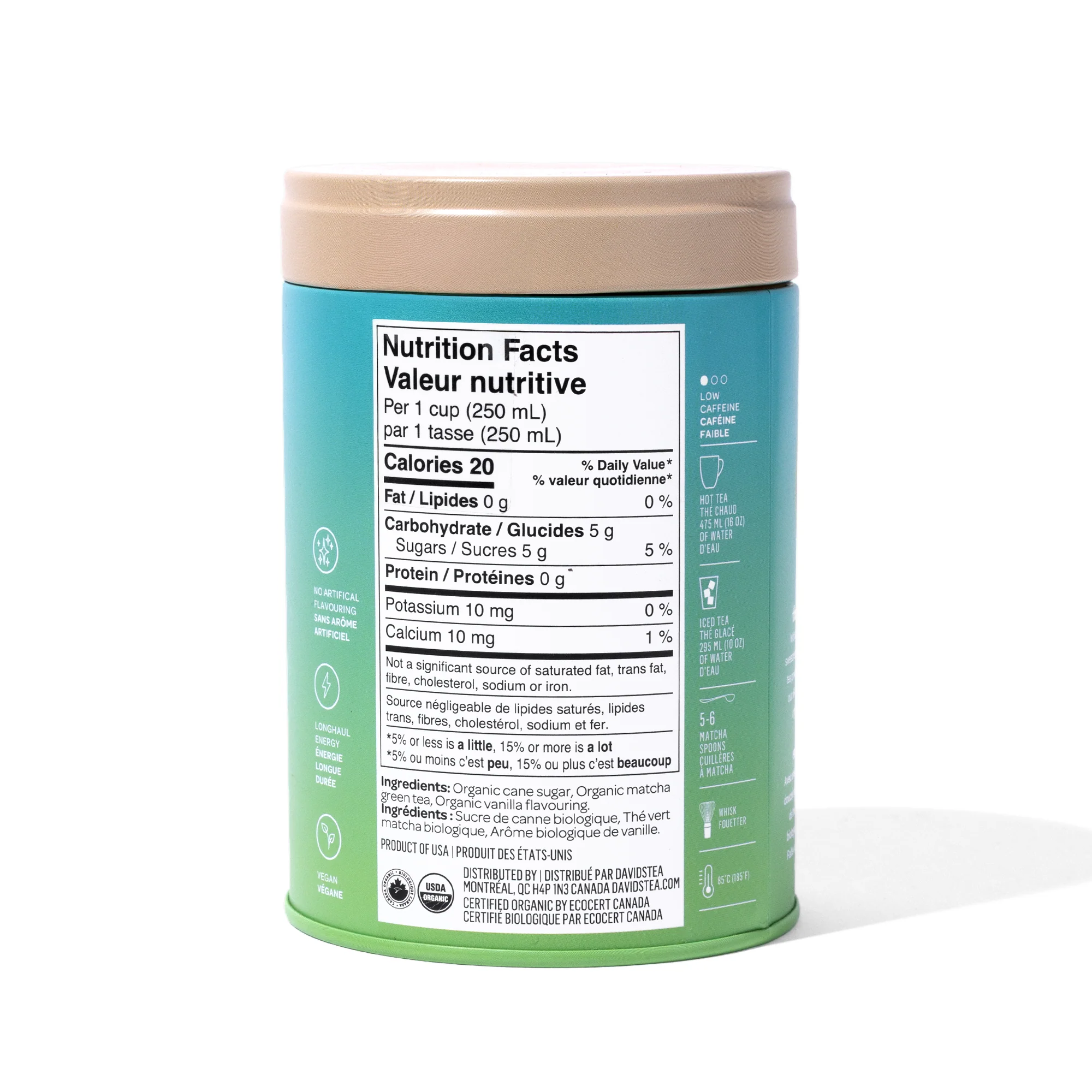 A creamy blend of organic matcha green tea, pure cane sugar and luscious vanilla. Served in our metal tea tins, which block out light and air, so tea stays fresh for longer.
